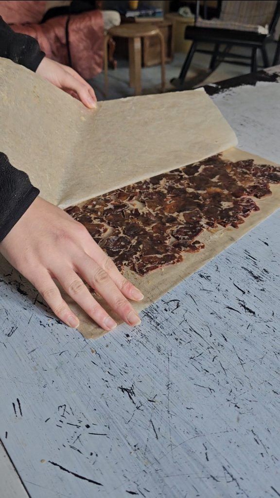Spread the mushrooms evenly, cover with another sheet of paper, and press down with something heavy or with a rolling pin.
